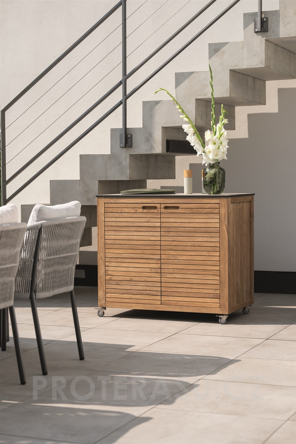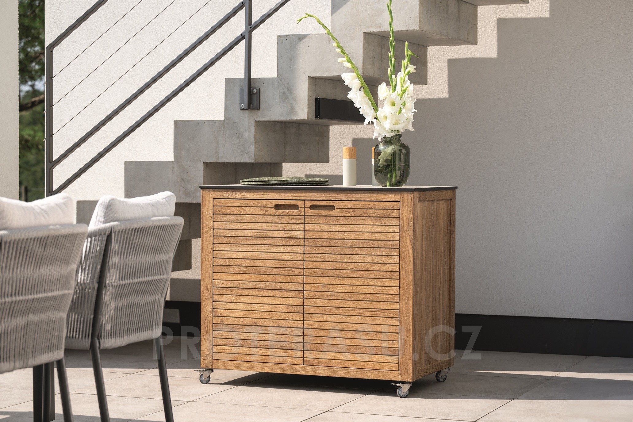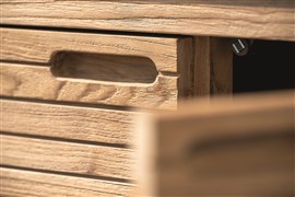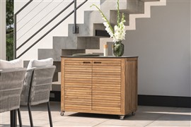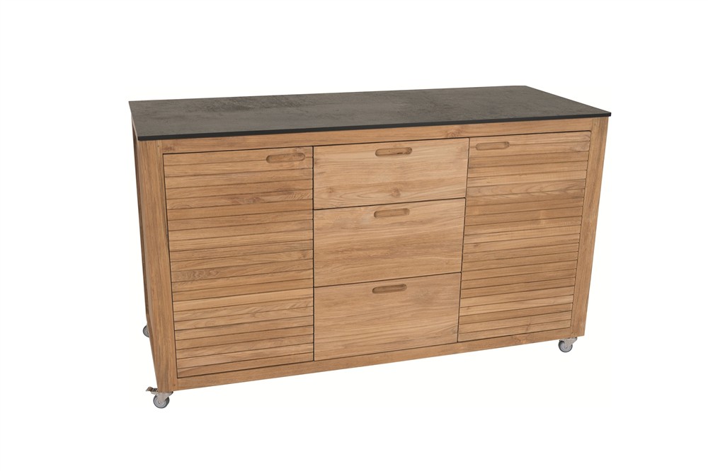 Praktický venkovní příborník na terasu s kolečky, je vyroben z teakového dřeva. Horní deska je z kompozitního materiálu HPL, snadno se udržuje. Příborník na terasu je robustní, uvnitř má praktické police, do kterých schováte veškeré drobnosti, nádobí, sedáky, deky nebo dětské hračky.