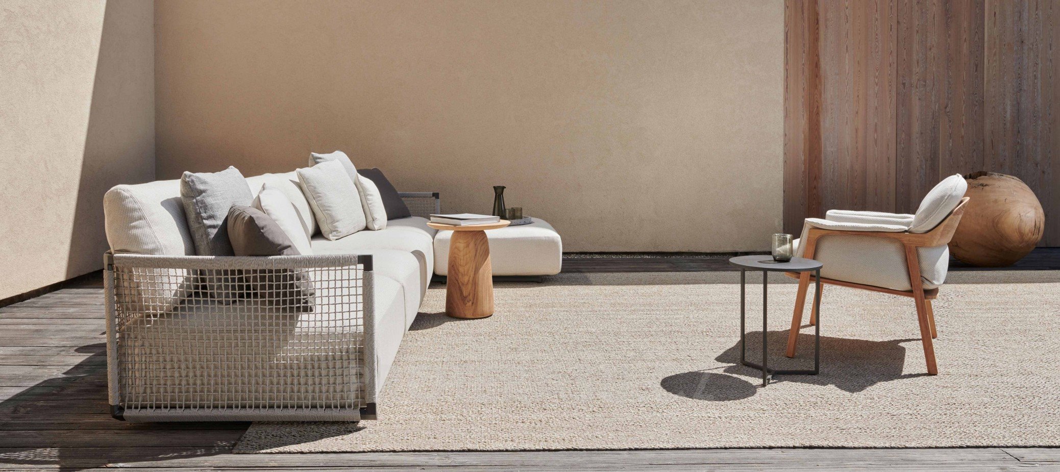 Venkovní koberec Loft od Tribu tkaný z potahovaného polyesteru. V nabídce ve 3 různých barvách.