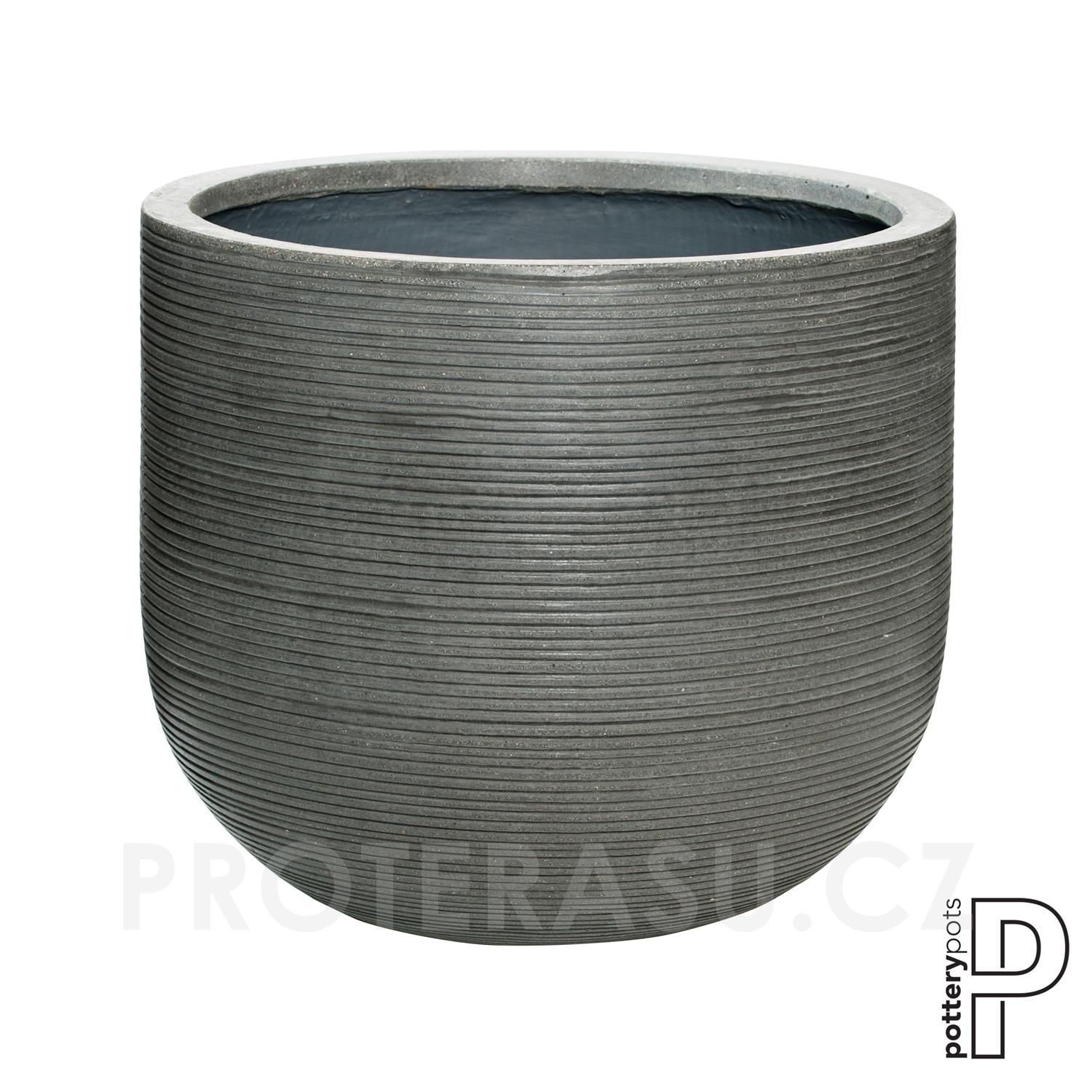 Venkovní květináč kulatý Cody L, Dark Grey (barva tmavě šedá, vodorovné pruhy), kolekce Ridged, materiál Ficonstone, průměr 42 cm x v 37 cm, objem cca 45 l