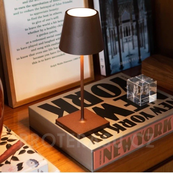 Stolní venkovní LED lampička Poldina Mini Pro, Zafferano, výška 30 cm x průměr 11 cm, hliník tmavě mahagonová (painted rust) vč.nabíječky