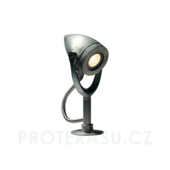 Konstrukce: pozinkovaný kov. Stínidlo venkovního osvětlení má design reflektoru. Reflektor je nastavitelný do několika úhlů. K nízkému světlu je nutné doobjednat žárovku s plochou optikou. Parametry doporučené žárovky: LED, příkon 5W, přívod 220V, patice GU10. Stupeň ochrany IP55. Bezpečnost kategorie 1. Doporučujeme objednat propojovací box. Rozměry: 7x11x40 cm (výš. vč. délky pod povrchem), délka přívodního kabelu 2,5 m.