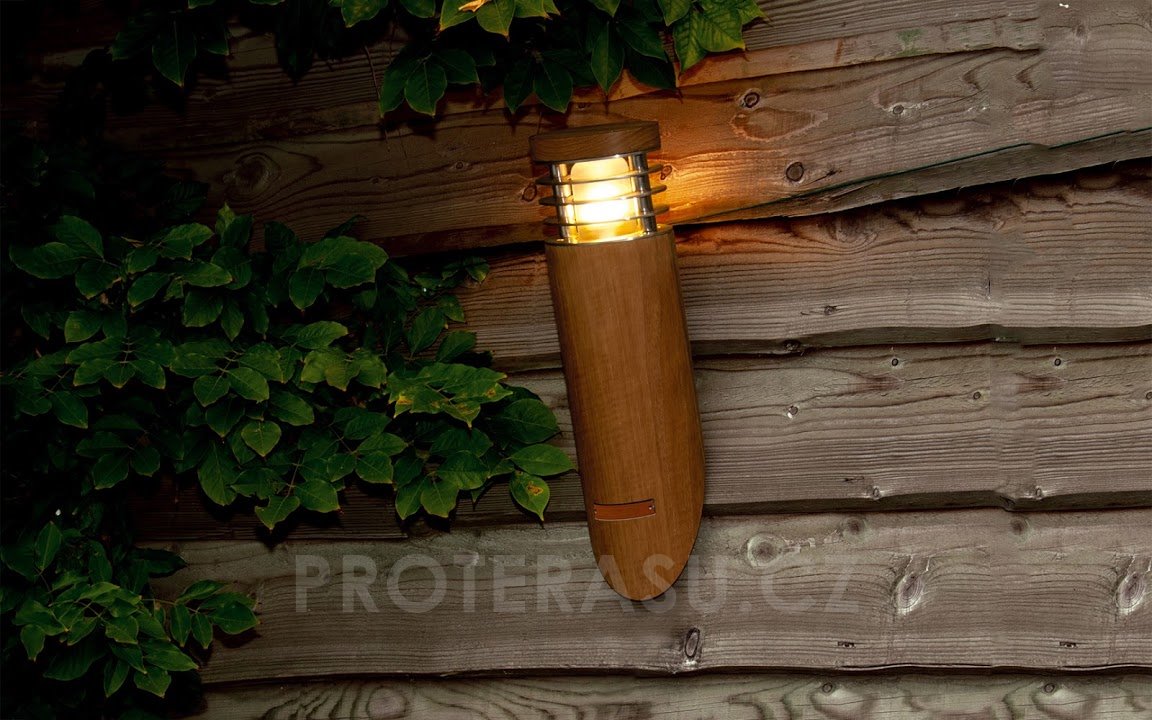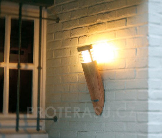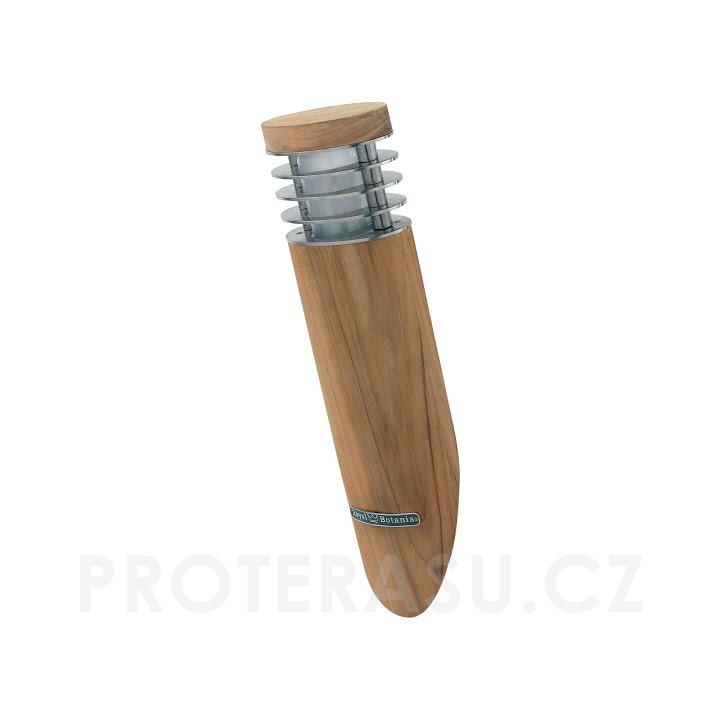 Nástěnná lampa je vyrobena z teakového dřeva. Stínidlo z nerezové oceli. K designovému nástěnnému světlu je nutné doobjednat žárovku. Parametry doporučené LED žárovky: FLUO, příkon max. 11W, přívod 220V/E27. Stupeň ochrany IP55. Bezpečnost kategorie 2. Rozměry: 8x12x42 cm.