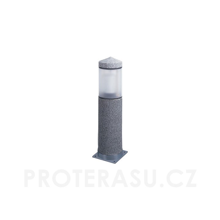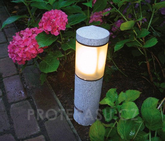 Designová lampa je kamenná (žula). Podtstavec a okraje stínidla jsou z nerezové oceli. K venkovnímu světlu je nutné doobjednat žárovku. Parametry doporučené LED žárovky: FLUO, příkon max. 11W, přívod 220V/E27. Stupeň ochrany IP55. Bezpečnost kategorie 2. Doporučujeme objenat také propojovací box. Rozměry: prům. 10 cm, výš. 40 cm, 11x11 cm (podstavec).