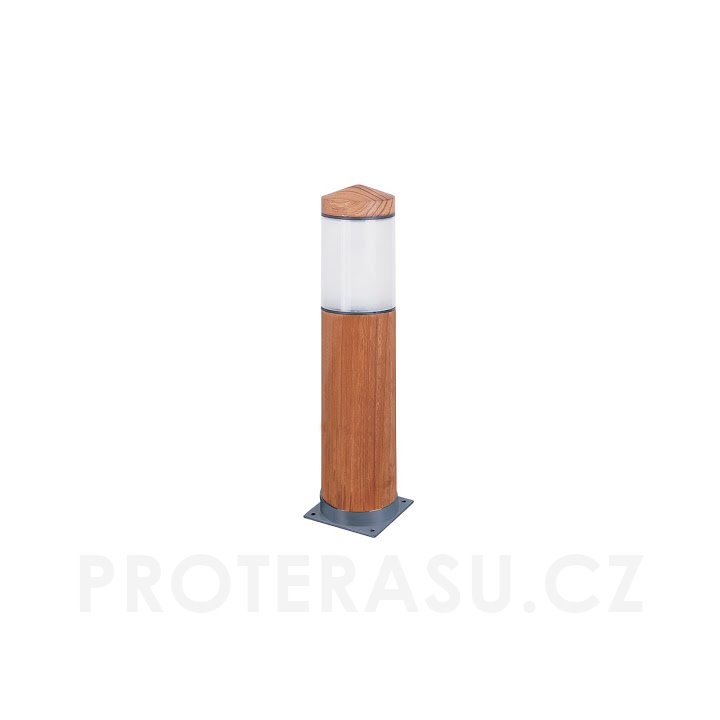 Designová lampa je vyrobena z teakového dřeva. Podtstavec a okraje stínidla jsou z nerezové oceli. K venkovnímu světlu je nutné doobjednat žárovku. Parametry doporučené LED žárovky: FLUO, příkon max. 11W, přívod 220V/E27. Stupeň ochrany IP55. Bezpečnost kategorie 2. Doporučujeme objenat také propojovací box. Rozměry: prům. 10 cm, výš. 40 cm, 11x11 cm (podstavec).