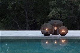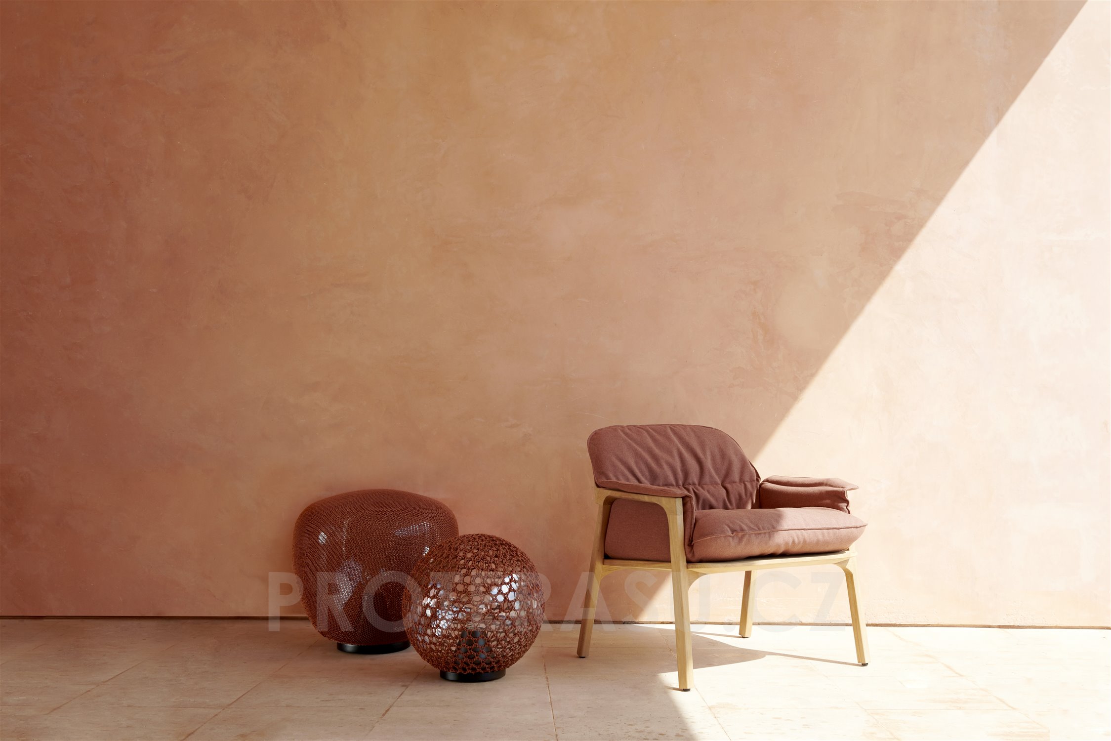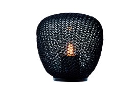 Venkovní samostatně stojící světlo Monsieur Madame Cachet značky Tribu. Širm je opleten háčkovaným vzorem z polyolefinového lanka.