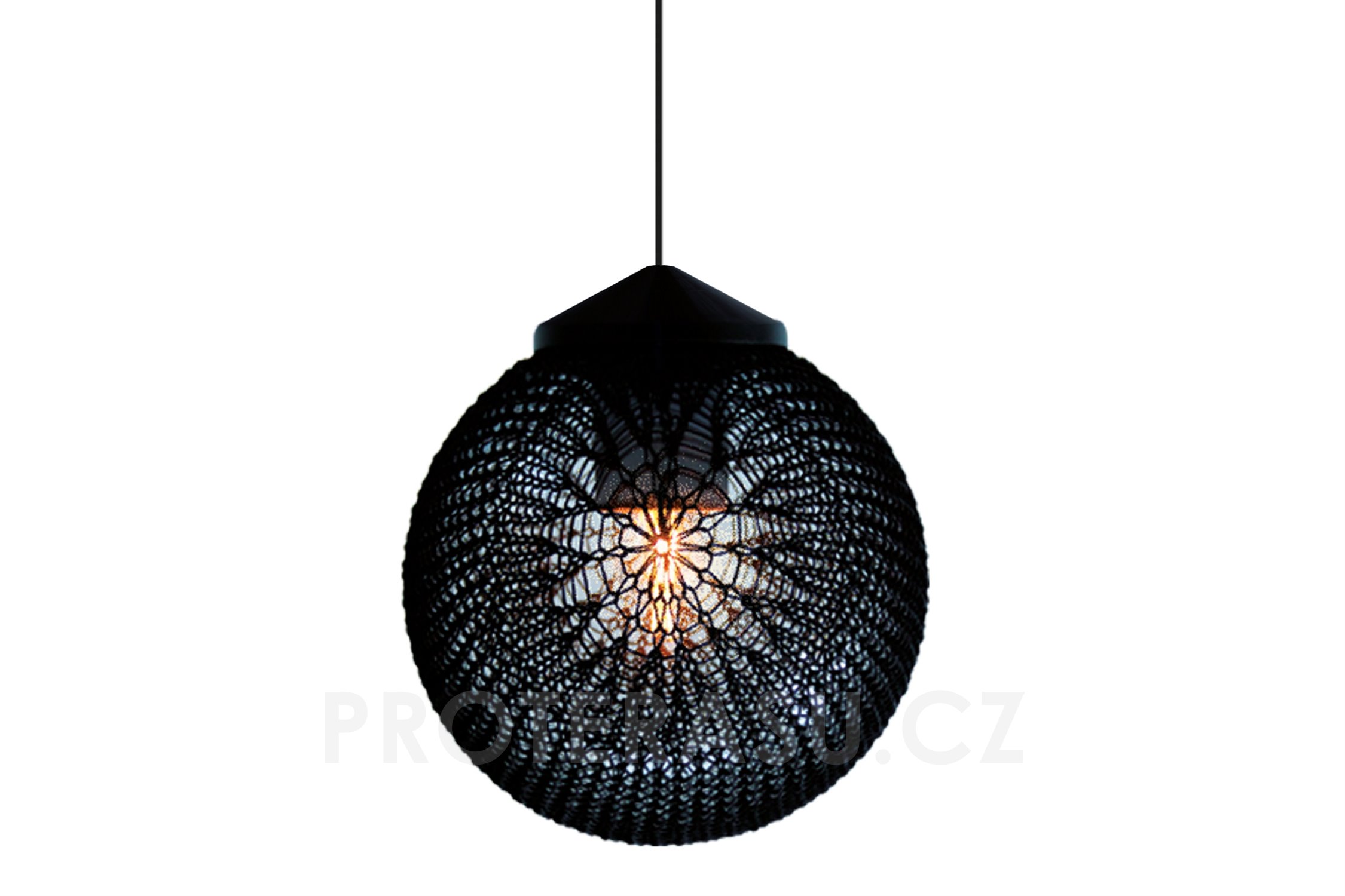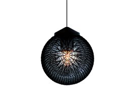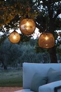 Venkovní závěsné světlo Monsieur Latoque značky Tribu. Širm je opleten háčkovaným vzorem z polyolefinového lanka. Světlo má LED žárovku.