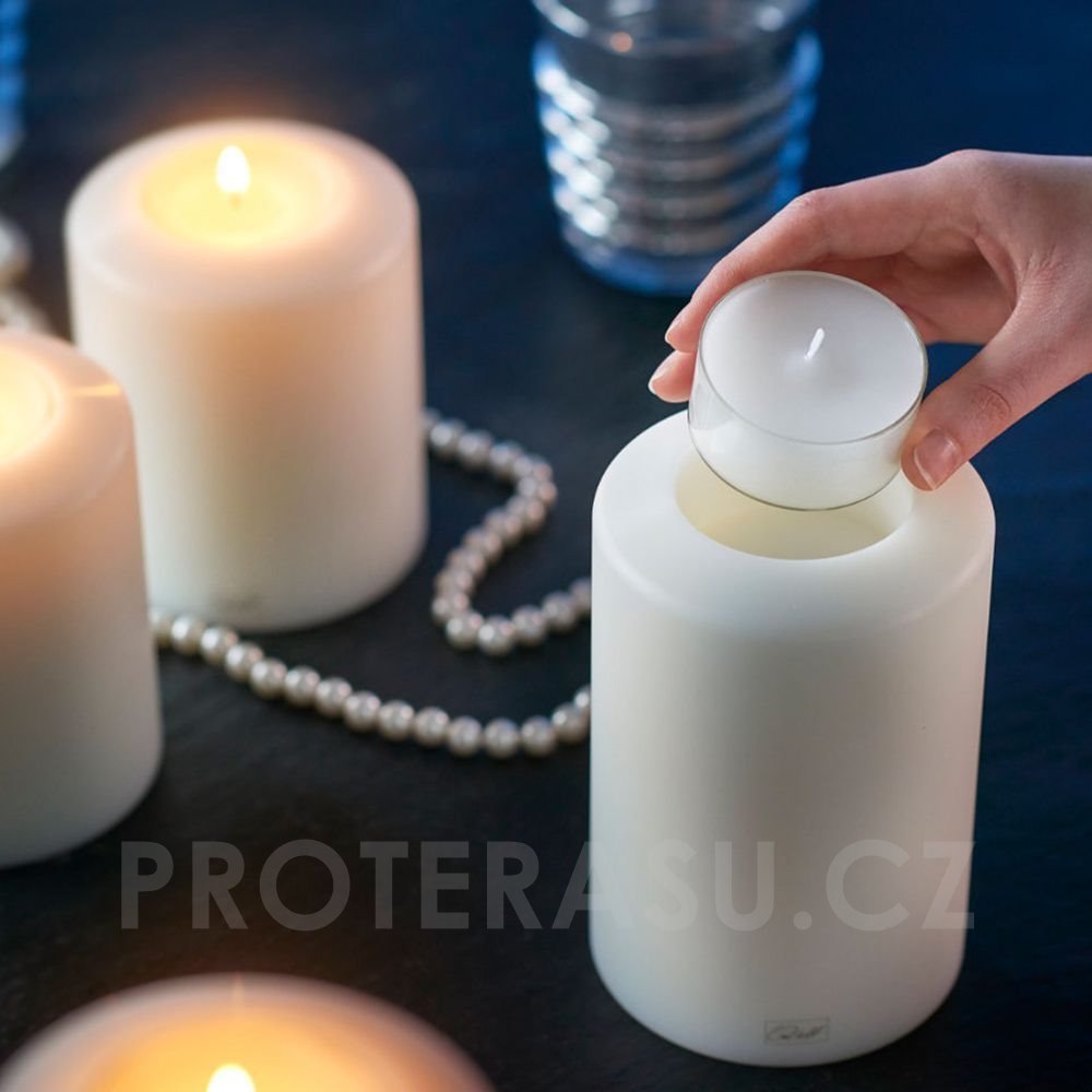 - Stačí vložit obyčejnou nebo k tomu určenou čajovou svíčku (doporučujeme koupit originální svíčky, které nabízíme jako příslušenství) do otvoru nahoře, plamen krásně prosvítí mléčně bílý obal.